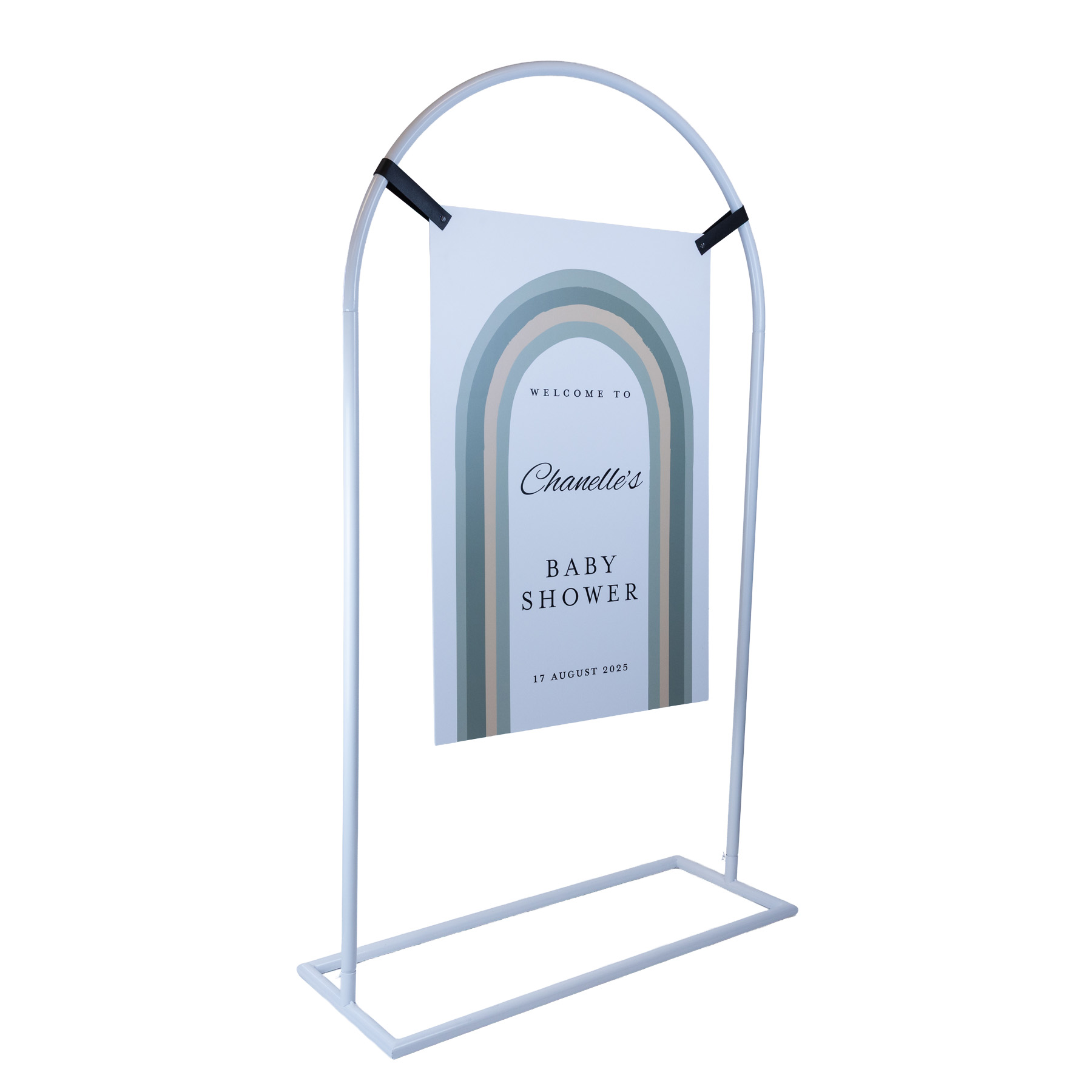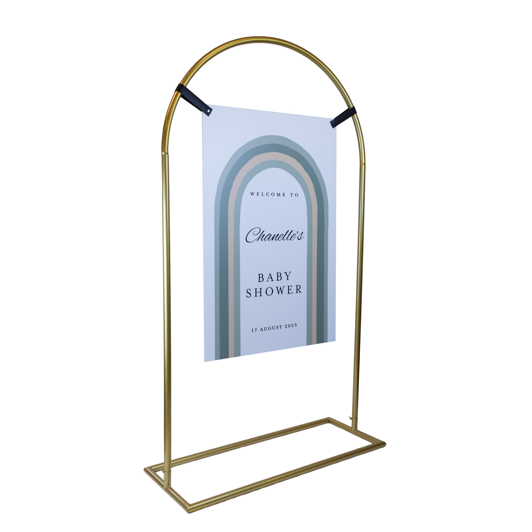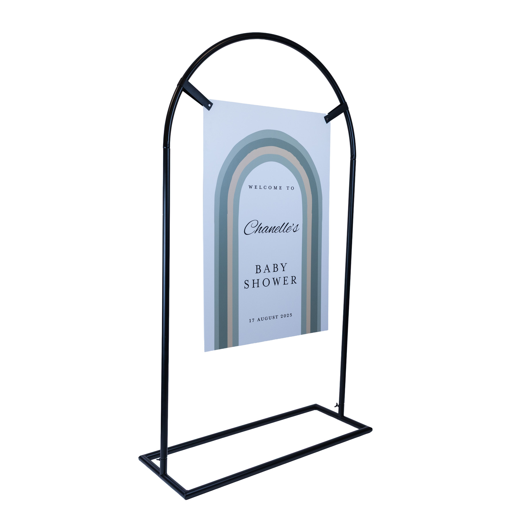 This arch signage stand is designed for suspended signage displays across weddings, events and commercial spaces. The curved metal frame gives your display a softer, more decorative look while still being practical to move, assemble and store. Use it for welcome signs, seating charts, menus or promotional signage, then style it further with florals or balloons if desired.
