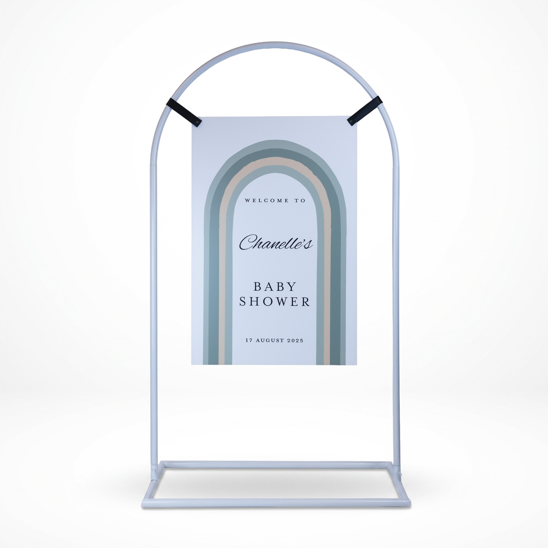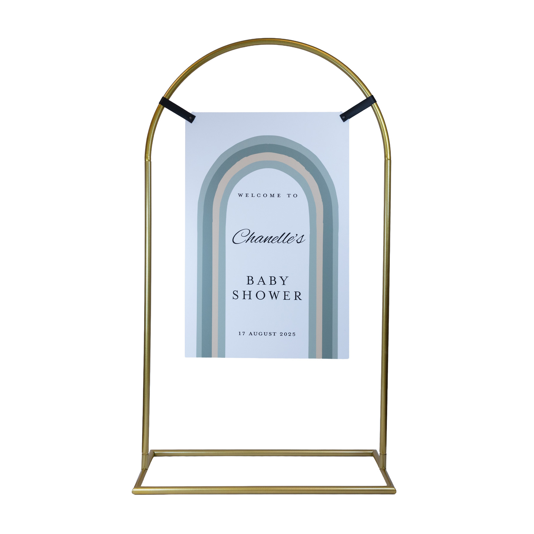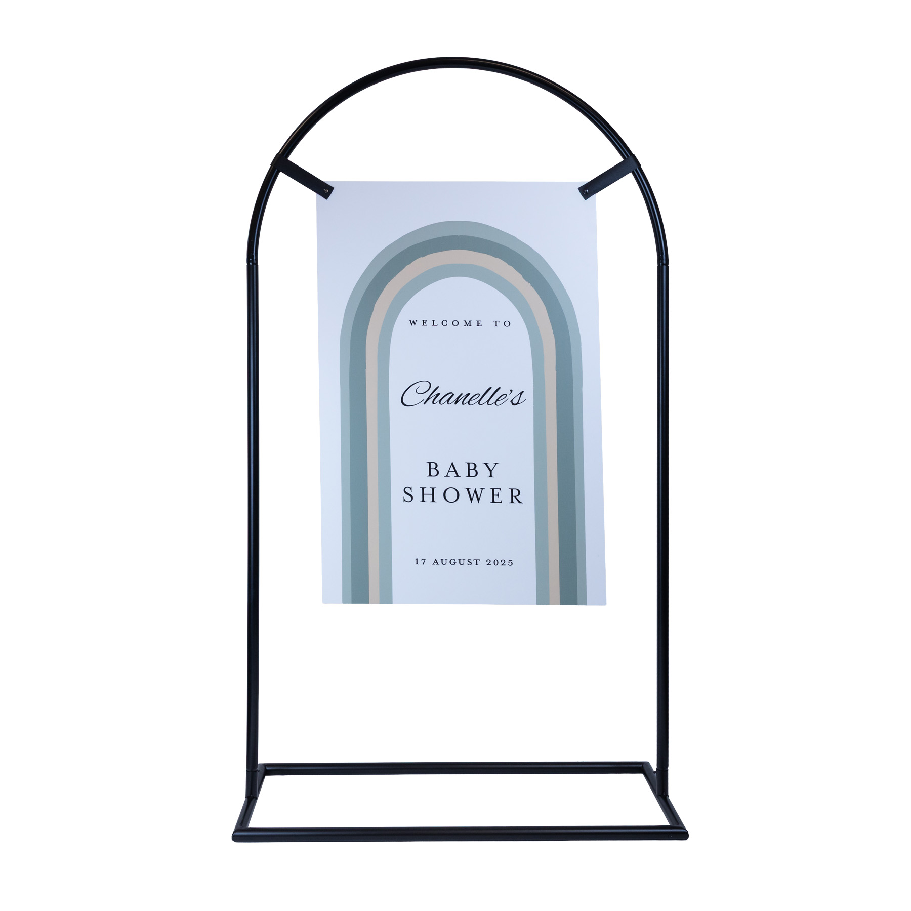 This arch signage stand is designed for suspended signage displays across weddings, events and commercial spaces. The curved metal frame gives your display a softer, more decorative look while still being practical to move, assemble and store. Use it for welcome signs, seating charts, menus or promotional signage, then style it further with florals or balloons if desired.