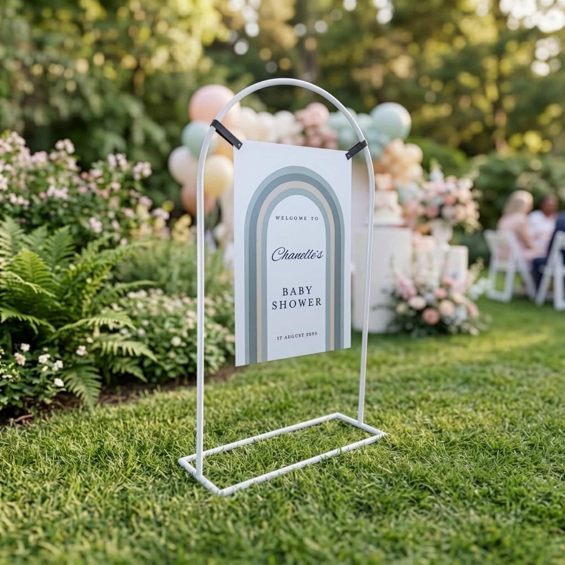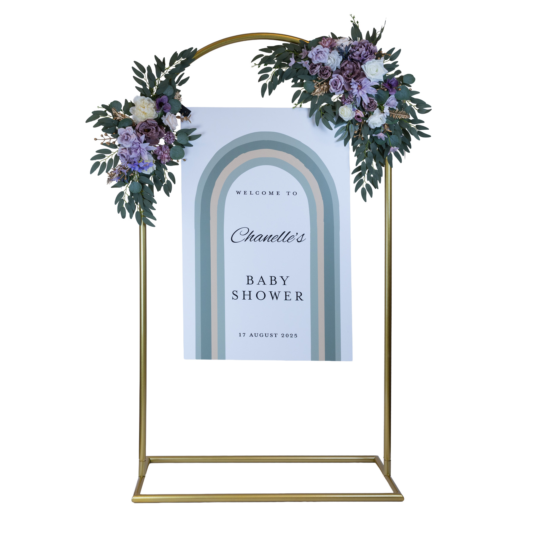 - Includes arch metal signage stand only