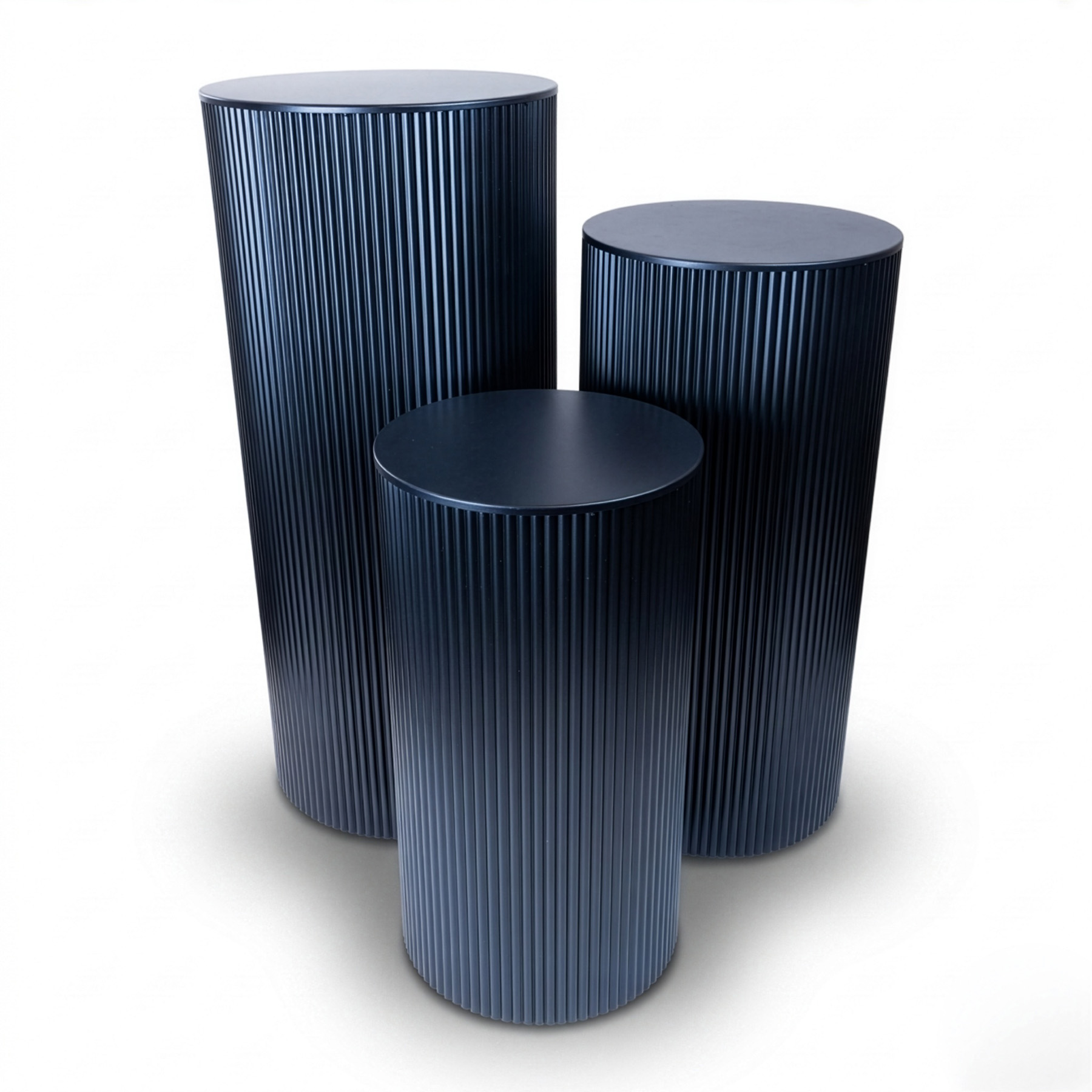 This ripple plinth set includes three fluted metal plinths in graduated heights for layered event and display styling. With flat tops, a gloss finish and lightweight hollow construction, they balance visual impact with practical handling. The nesting design also makes them easier to transport and store between uses.